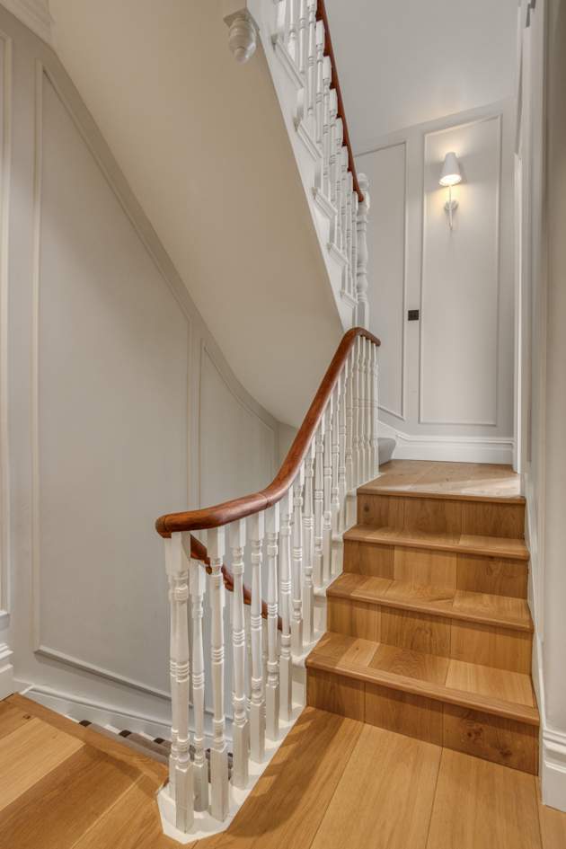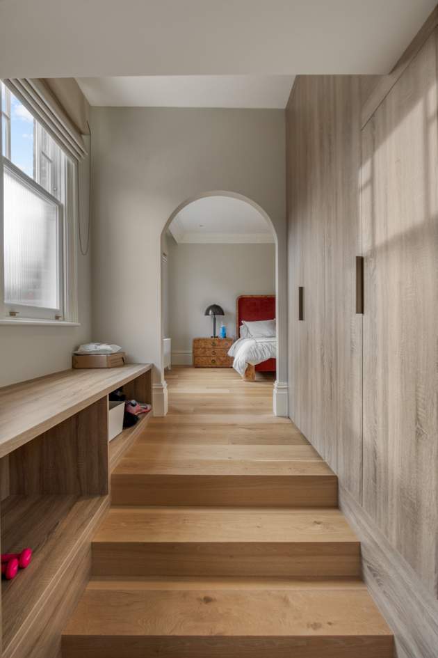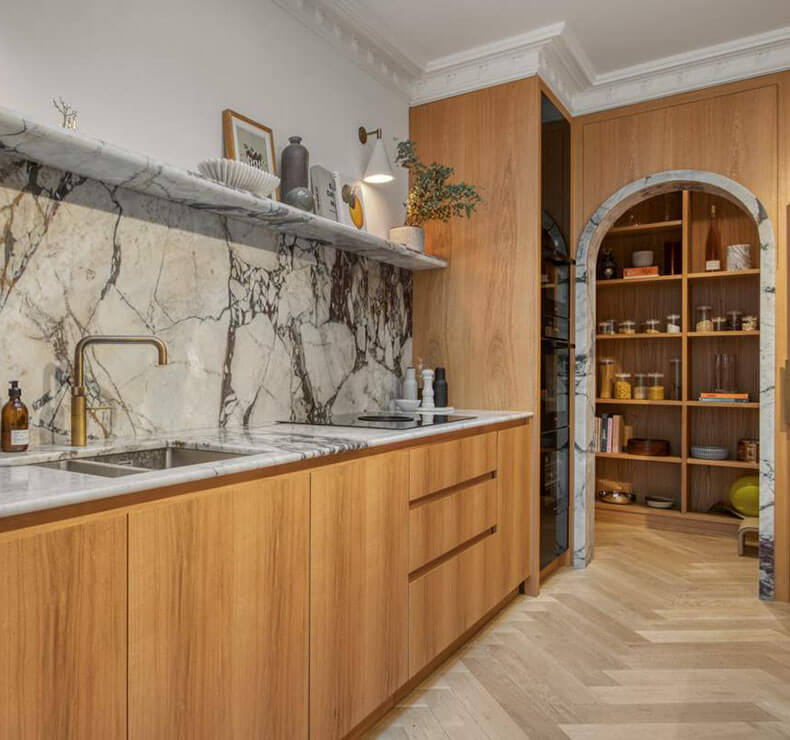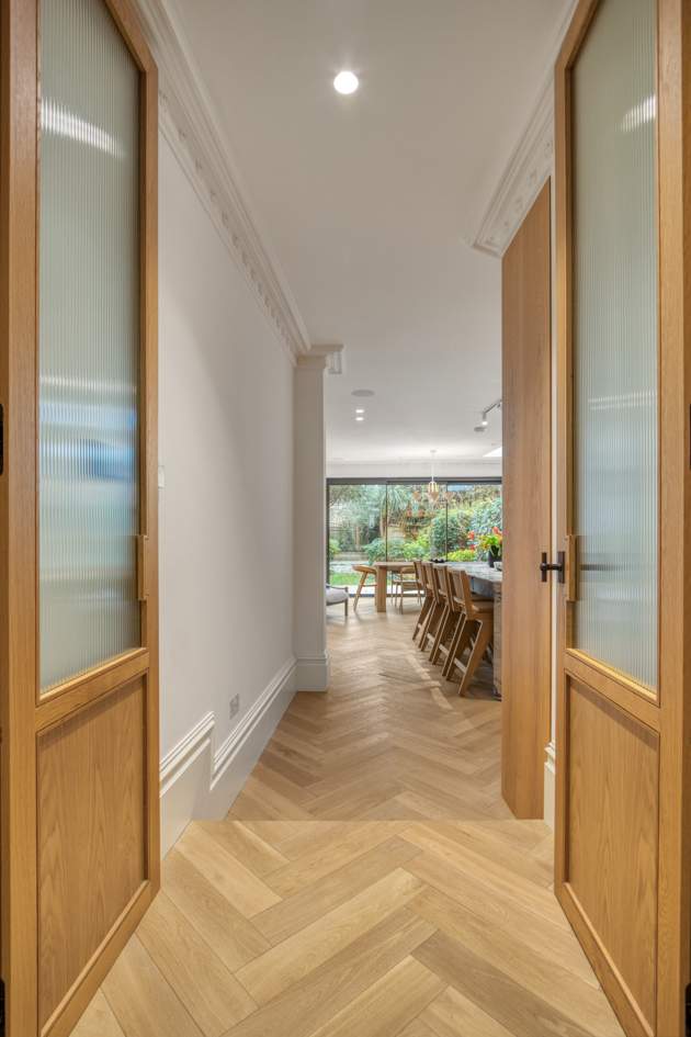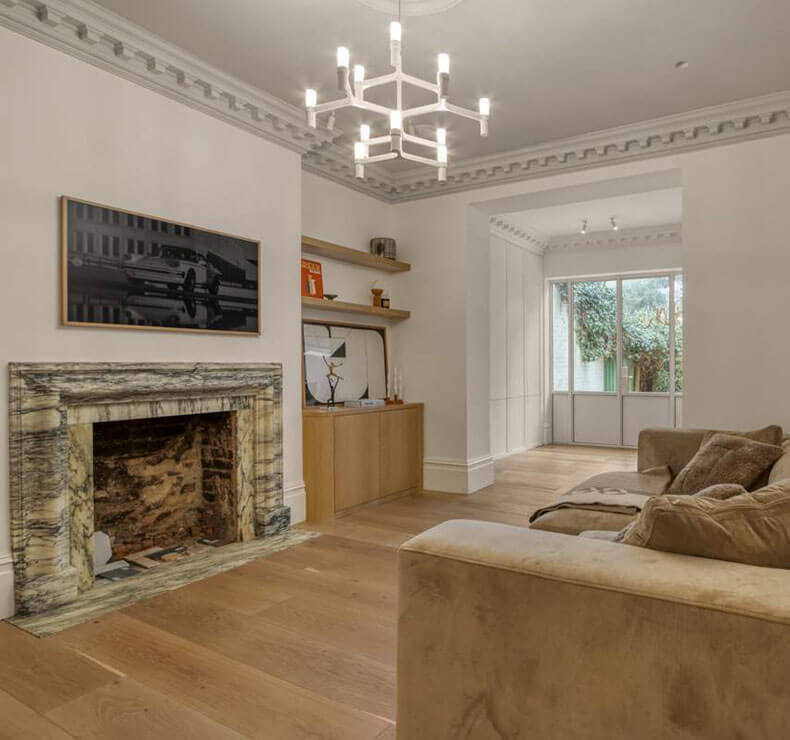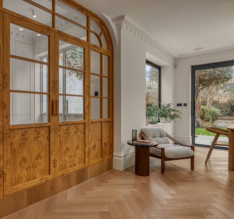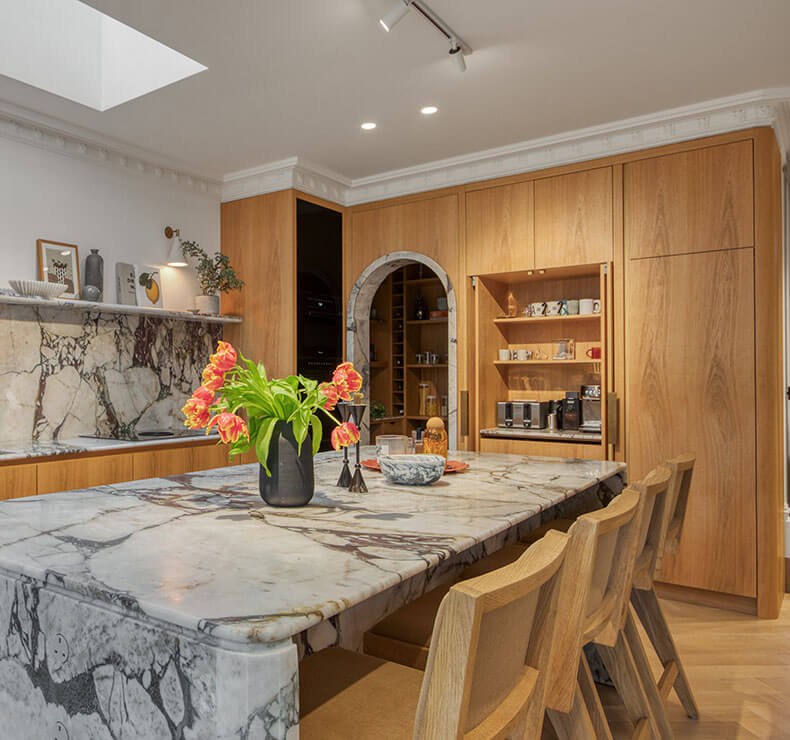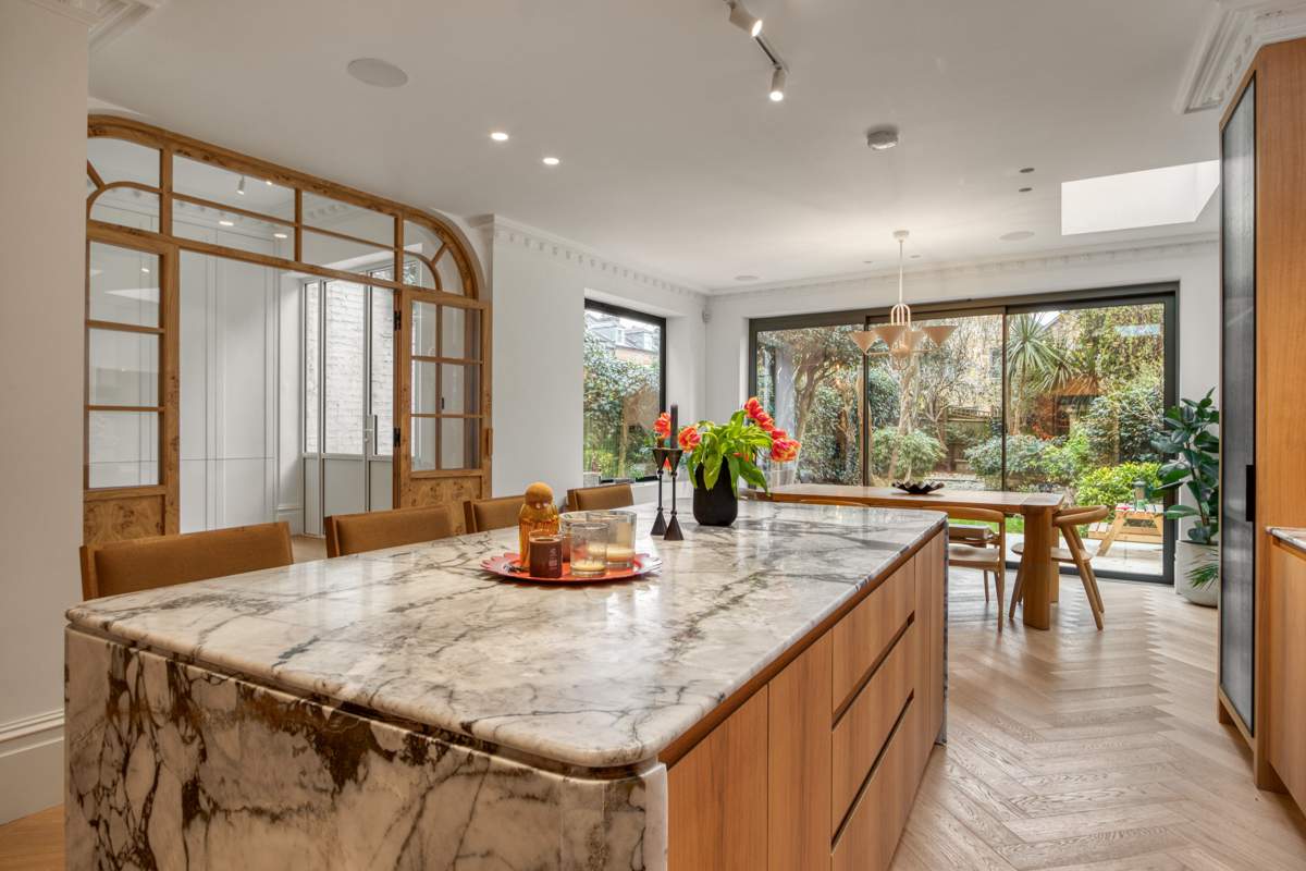 This bespoke side house extension in the sought-after area of Crouch End seamlessly combines luxury and functionality. The design features a striking waterfall-effect kitchen island and matching backsplash, creating a harmonious centerpiece for the home. A walk-in pantry enhances the space with practicality and elegance, while the full-house refurbishment redefines modern living with meticulous attention to detail. Crafted for clients with refined tastes, this house extension in Crouch end embodies sophisticated design tailored to a high-end lifestyle.