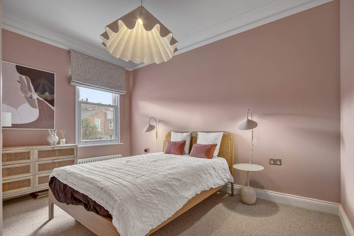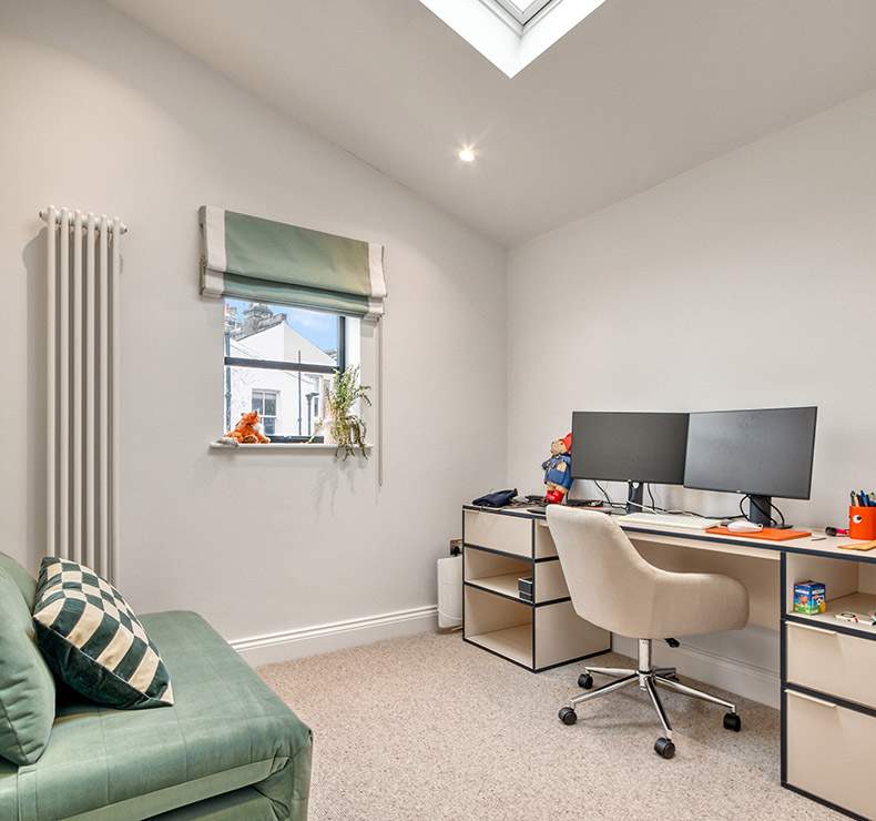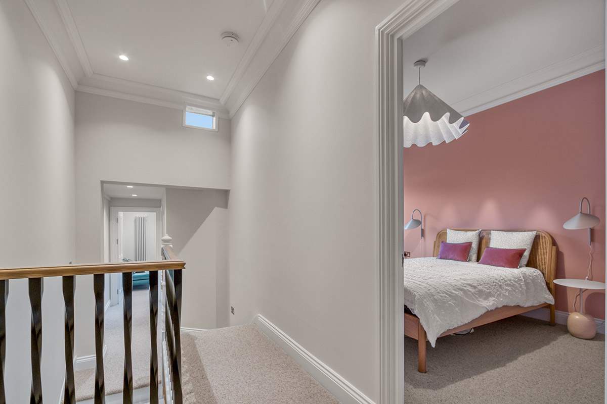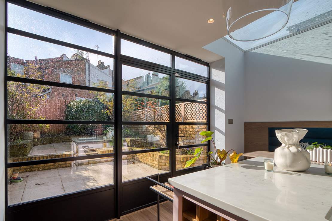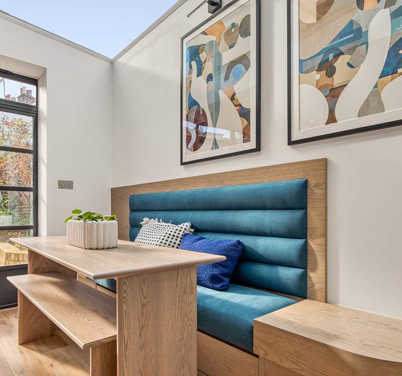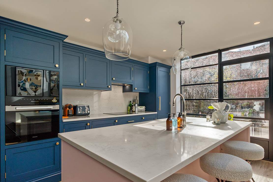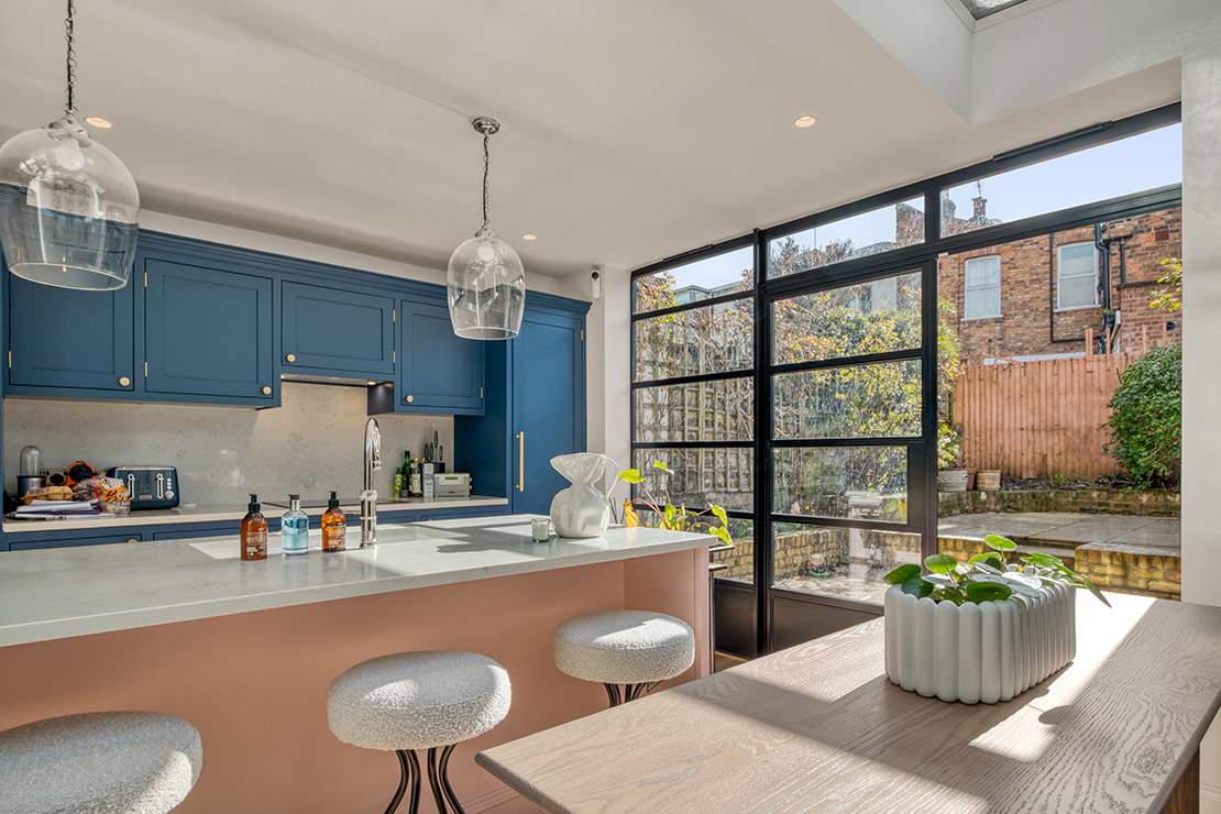 This house extension in Highbury has been transformed with a striking side extension, crowned by a stunning glass roof that floods the space with natural light. At the heart of the design is a bespoke kitchen featuring rich navy blue cabinets paired with a bold pink island with an integrated sink, creating a perfect balance of elegance and playfulness. The island is complemented by sleek bar stools, making it an inviting space for both casual dining and entertaining.